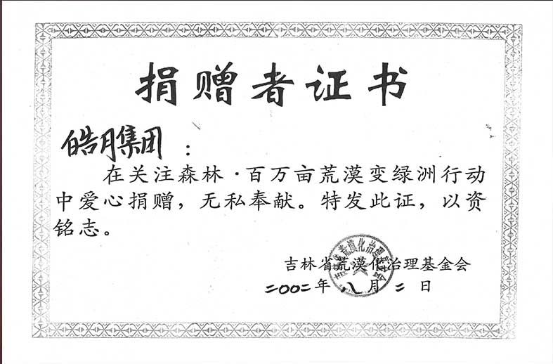 吉林省荒漠化治理基金會捐贈者證書